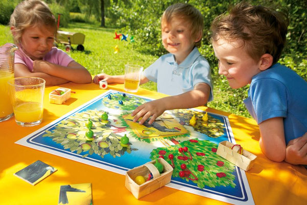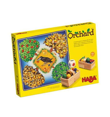 The Orchard Game from HABA celebrated 30 years in 2016 and has sold over 3 million copies worldwide! Red cherries, yellow pears, blue plums and green apples hang from the trees in the orchard. The bold raven wants the delicious fruit too. The players must harvest the fruit quickly before the raven can grab it. A simple entry level game for children, where each player rolls the die to see which fruit they may harvest with the baskets. Watch out though. if the raven is rolled, one more piece of the raven puzzle is built in the centre! A great family cooperative game as everyone works together to collect the fruit before the raven puzzle is complete! Game includes 10 wooden apples, 10 wooden Paris of cherries, 10 wooden plums, 1 raven, 4 fruit baskets, 1 raven jigsaw 9 pieces, 1 colour symbol die and instructions.